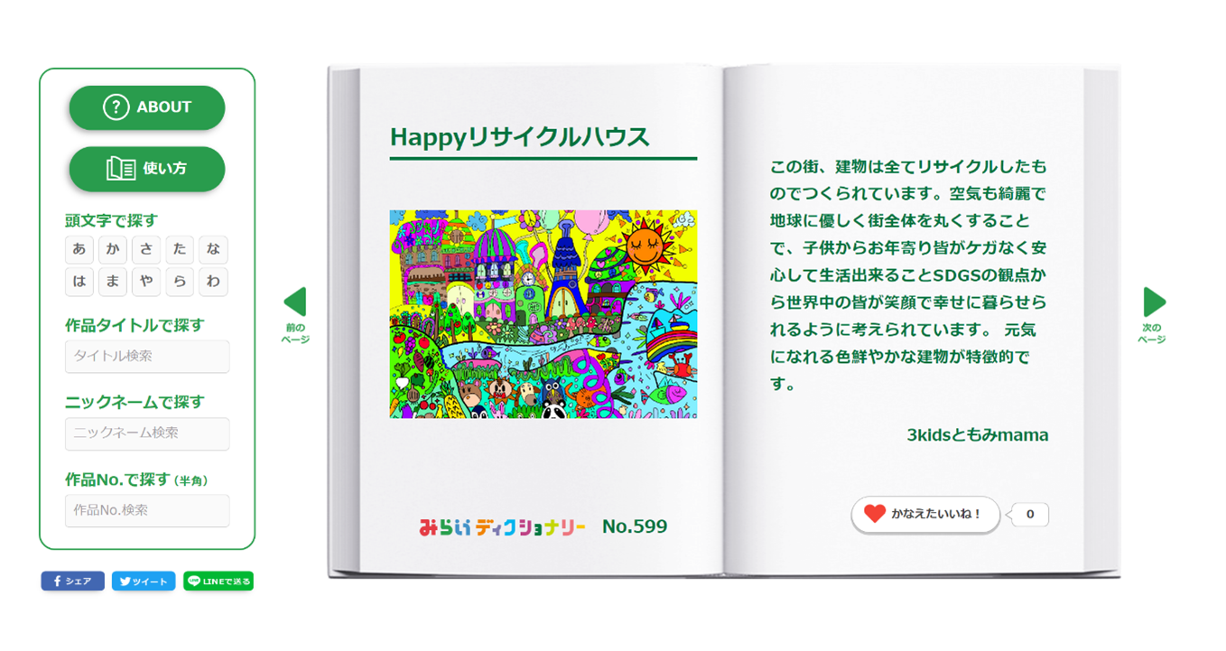 『みらいディクショナリー』は、まちに住まい、働き、集う、ひとりひとりの「あったらいいな」「こうなったらいいな」というまちや未来への希望・想いを詰め込んだ「未来のまち」の絵を、「サステナブルなまちづくり」をかなえるアイデアの種としてデジタルブックに集録した、世界でたったひとつの“未来のまち”の大辞典です。各作品ページに設けている「かなえたいいね!」ボタンは、閲覧者が気に入った作品や実現したいと思う作品に対して、SNSのように共感等の気持ちを示すというアクションを通して、サステナブルな未来を想像するきっかけや、実現に向けた行動の促進につながっていくことを企図しています。
