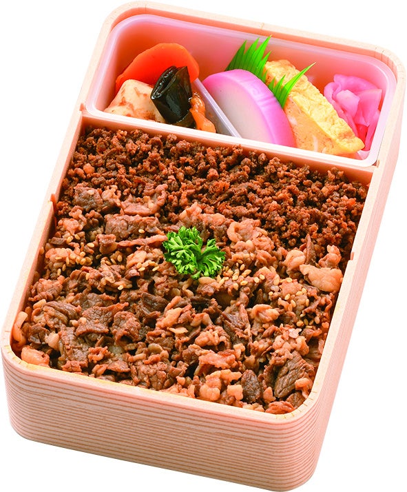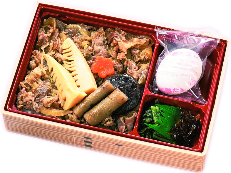 東海地域の銘柄牛や味噌カツなど地域色あふれる肉系駅弁を得意とする創業100余年の老舗調製元「松浦商店」。日本三大和牛の一つ「松阪牛」をタマネギとともに甘辛く濃いめの味付けに煮つけ、半熟卵を絡めてすき焼き風に楽しむことができる牛肉駅弁です。タケノコ・ゴボウ・シイタケのうま煮のほか、付け合わせにわさび菜のおひたしを添えています。
