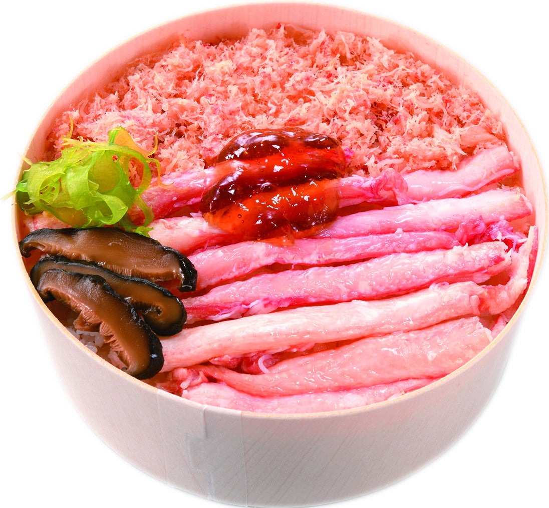 1896年、北陸線(現・JR北陸本線)で初めて駅弁を販売した「高野商店」。甘酢でしっとりと仕上げた紅ズワイガニの棒肉・そぼろをカニ飯の上に敷き詰め、アクセントに同店特製のカニ酢のジュレを合わせ、ほど良い酸味がカニの旨みを引き立てるやさしい味わいに仕上げています。