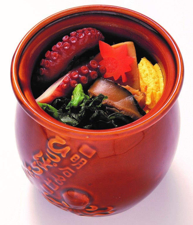 駅弁販売開始から120年の歴史を持つ老舗調製元「淡路屋」が、明石海峡大橋の開通を記念して1998年に発売したロングセラー駅弁。タコ壺を模した陶器の中に、醤油ご飯を詰め、タコのうま煮、アナゴしぐれ煮、菜の花、錦糸玉子などを彩り豊かに盛りつけています。“最後まで楽しんでもらえるように”と、ご飯の中にタコのすり身で作った「タコ天」を忍ばせる心遣いも人気の理由の一つです。
