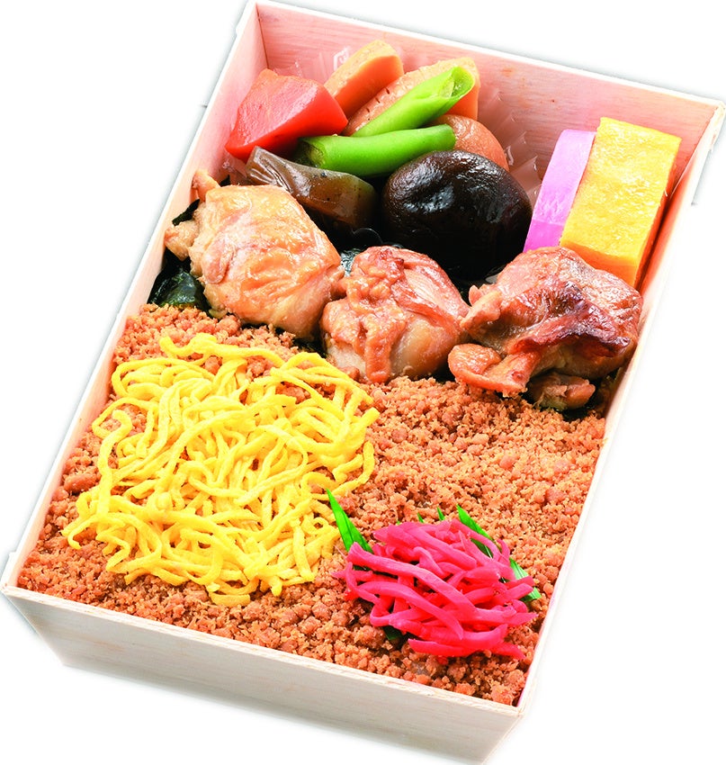1950年代後半ごろから「松廼家」の看板商品として人気の「とりめし」。現在販売する「とりめし」は、時代のニーズに合わせてとりめし部分の割合を増やした“肉が主役”のものですが、列車の乗車時間が長かった発売当時は、車中で「駅弁をつまみに一杯飲む」という習慣から、おかずが種類豊富に入った“幕の内系”の駅弁でした。「復刻版 とりめし」は、日本国有鉄道(当時)時代のレシピと掛け紙をもとに試行錯誤しながら、どこか懐かしい素朴で甘めの味付けや盛付けを可能な限り再現した“復刻駅弁”。茶飯の上に鶏そぼろと海苔を敷き、鶏の照り焼きや煮物などを合わせています。