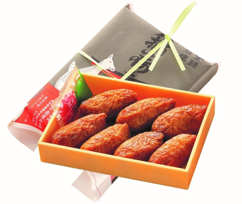 1889年の創業以来、変わらず手作業で作る「壺屋弁当部」のいなり寿司。地元・三河産の醤油と白ザラメを継ぎ足しながら丁寧に煮つけた油揚げは、一般的なレシピのおよそ倍量の調味料を使った甘く濃い味付けが特徴です。やわらかく握った酢飯に油揚げの煮汁の旨みが広がり、“やみつきになる”と根強いファンが多い一品。豊川稲荷のお狐さまが描かれたレトロな雰囲気の掛け紙でも知られています。
