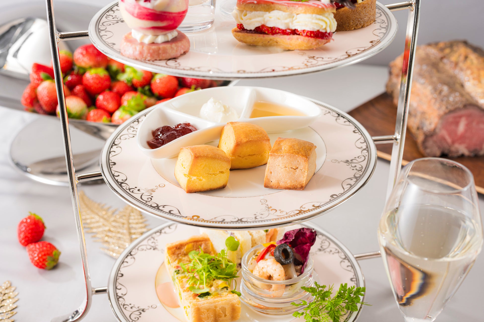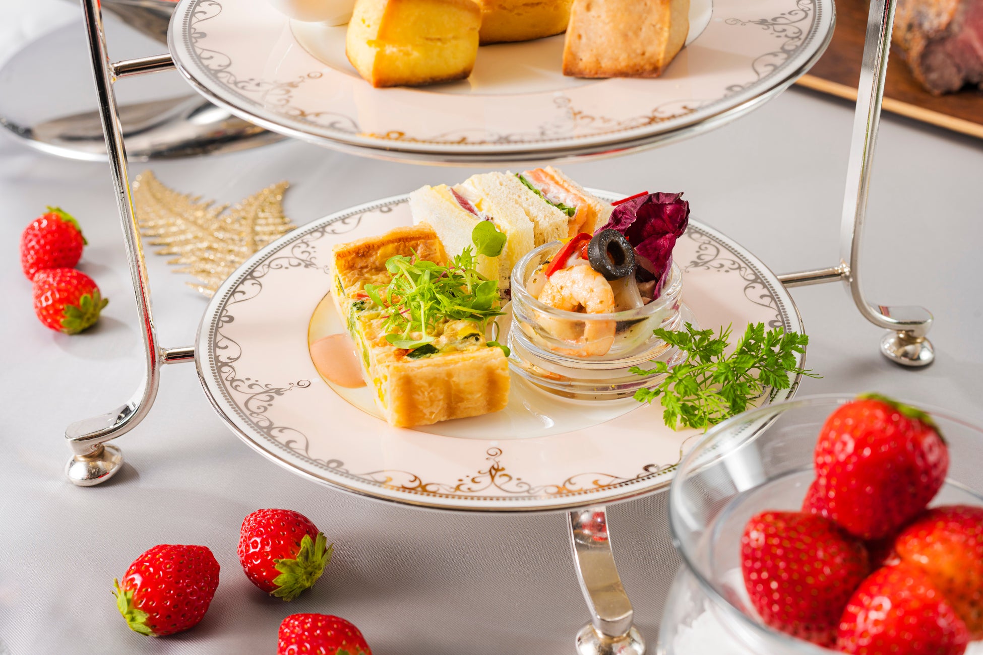 甘酸っぱい旬の苺を存分に楽しめるアフタヌーンティーセットが、「ベイ・ビュー」に新登場いたします。上段には、小さなパフェをイメージしたグラスデザート「苺のヴェリーヌ」や、サクサク食感のタルトと、みずみずしい苺がマッチした「苺のタルト フロマージュクリーム」、見た目も愛らしい「フランボワーズのエクレア」など、心躍るストロベリースイーツを5種類ご用意いたします。中段の、プレーンとストロベリー2種類の香ばしい焼きたてスコーンは、ストロベリージャム、クロテッドクリーム、メープルシロップでお楽しみください。下段には「フレッシュストロベリーサンド」や「スモークサーモンサンド」の他、ホテルならではのセイボリー「シーフードの地中海マリネ」や「彩り野菜のキッシュ」もお楽しみいただけます。加えて、ホテル自慢の「ローストビーフ」やフルーツそのものの味わいを楽しめる「フレッシュストロベリー」も、お席にお届けいたします。さらに、20種類以上の紅茶はもちろん、スパークリングワインもフリーフローでご提供。フレッシュストロベリーの甘酸っぱさと絶妙に調和する爽やかな一杯をお楽しみください。特別な日のお祝いにはもちろん、自分へのご褒美にもぴったりな贅沢なひとときを演出するアフタヌーンティーセットです。ホテル最上階から見渡すパノラミックな横浜の景色と共に、優雅なホテルライフをお過ごしください。
