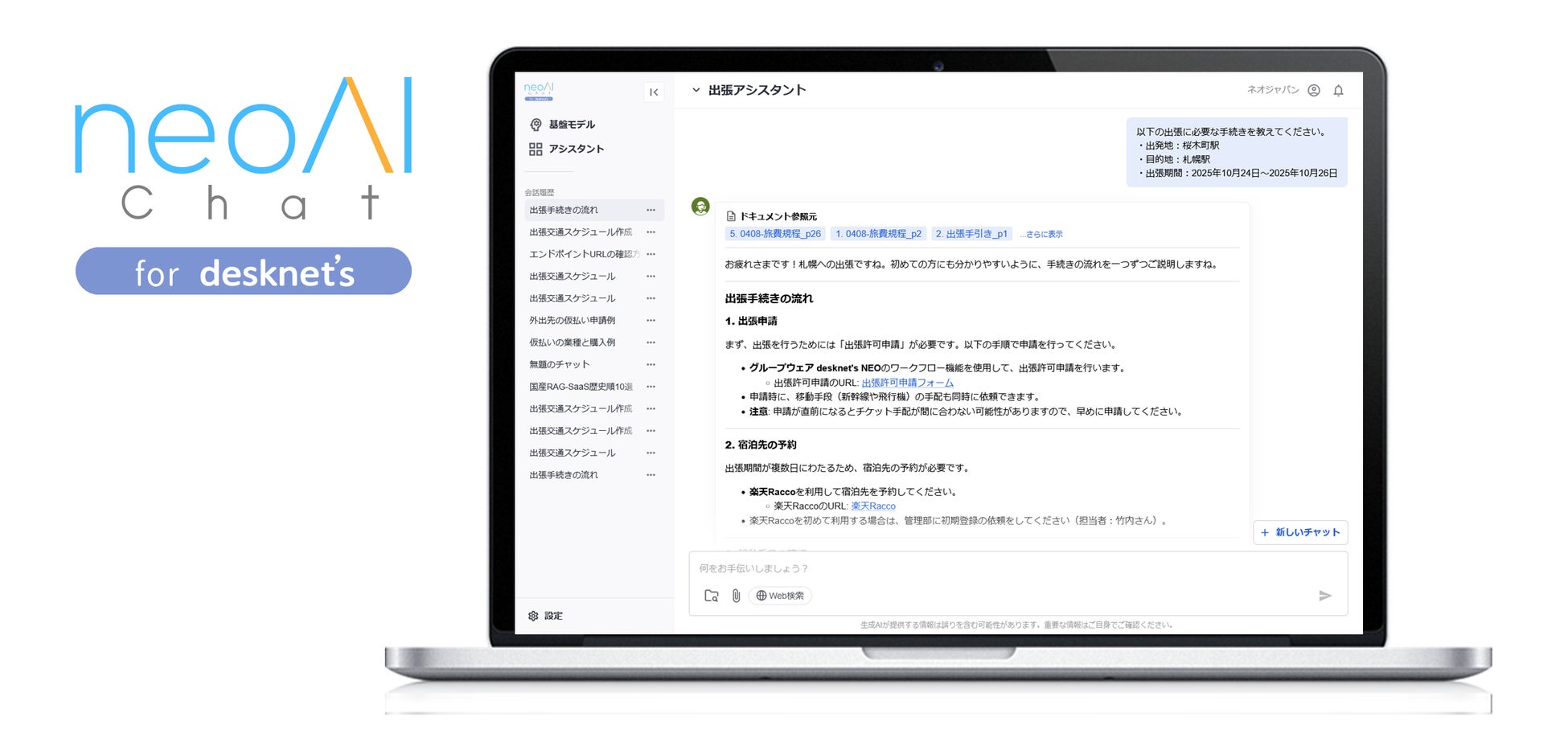株式会社ネオジャパン(本社:神奈川県横浜市、代表取締役社長:齋藤 晶議)は、社内データ×生成AIをノーコードで実現する生成AIプラットフォーム『neoAI Chat for desknet's』を、2025年9月9日(火)に提供開始します。同時に『neoAI Chat for desknet's』で作成したAIアシスタントとの連携に対応したグループウェア『desknet's NEO』V9.5とビジネスチャット『ChatLuck』V6.7の提供も開始します。