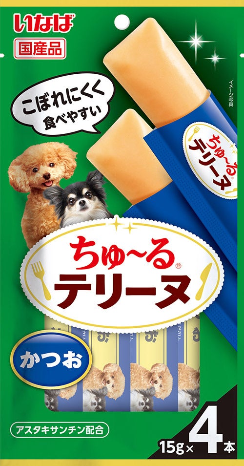 いなばペットフード株式会社(いなば食品グループ 本社:静岡県静岡市清水区由比)は、わんちゃん用おやつ「ちゅ~るテリーヌ」の新フレーバー4種類を発売いたしました。お魚・チーズ・さつまいもをベースとしたおいしい味の仲間入りです。