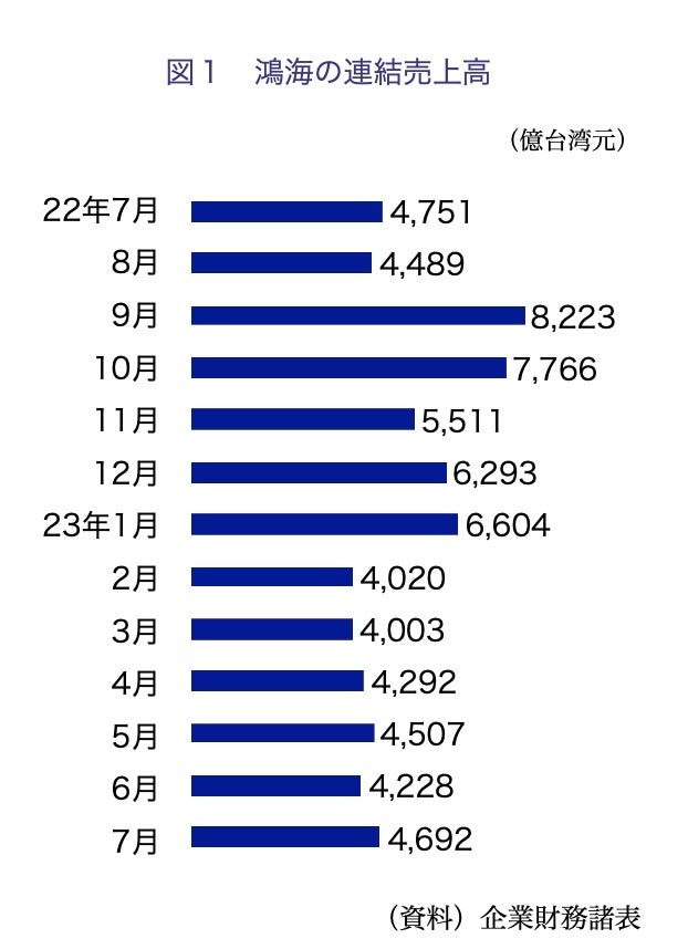 鴻海精密工業(ホンハイ)が2023年8月14日に発表した第2四半期(4~6月)の連結売上高は前期比10.8%減、前年同期比14%減の1兆3045億台湾元、純利益は前期の2.57倍、前年同期比1%減の330億100万元で、同期として過去2番目の高水準だった。