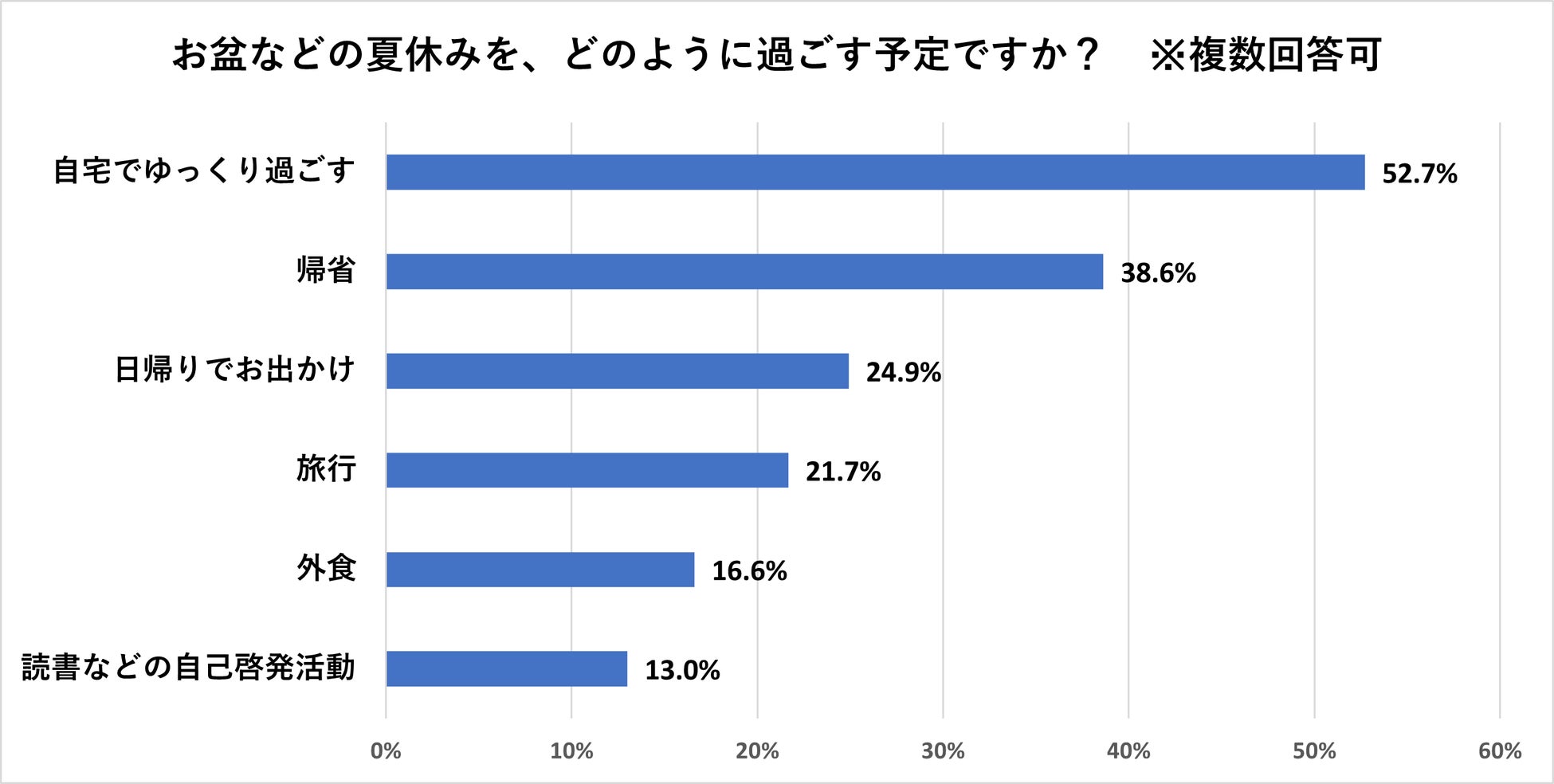 「お盆などの夏休みを、どのように過ごす予定か」複数回答で質問したところ、「自宅でゆっくり過ごす」が52.7%と唯一過半数を超えました。次いで「帰省」が38.6%、「日帰りでお出かけ」が24.9%となりました。一方で「旅行」は21.7%、「外食」は16.6%、「読書などの自己啓発活動」は3.0%にとどまりました。今夏はコロナ禍による行動制限がなくなった反面、できるだけ自宅や近場で夏休みを楽しむ傾向がうかがえました。