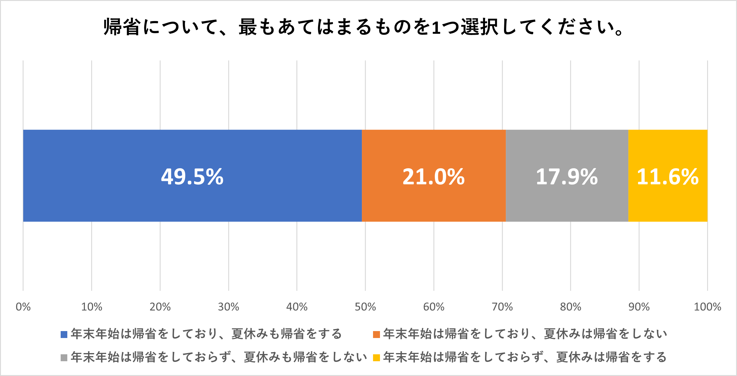 「夏休みに、実家・地元へ帰省するか」について質問したところ、「帰省する」と答えた方の合計が61.1%となり、「帰省しない」の回答合計38.9%を上回る結果となりました。また、「帰省する」の中では、「年末年始も帰省している」との回答が49.5%と、「年末年始は帰省していない」の11.6%を大きく上回り、年末年始に続き夏休みも帰省する人が多いと言えます。「帰省しない」の中では、「年末年始は帰省している」が21.1%、「年末年始は帰省していない」が17.9%という結果となりました。