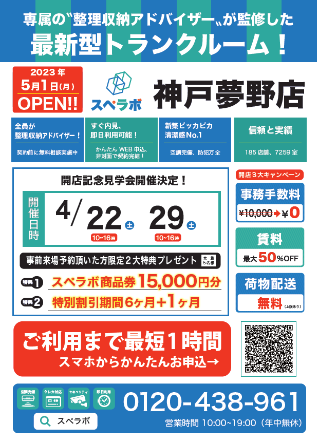 【神戸夢野店/5月1日(月)オープン】見学から契約、解約まで完全非接触・非対面、お申し込みからご利用まで最短1時間!都内、大阪などにて絶賛運営中のトランクルーム【スペラボ】が湊川公園駅近くに出店!