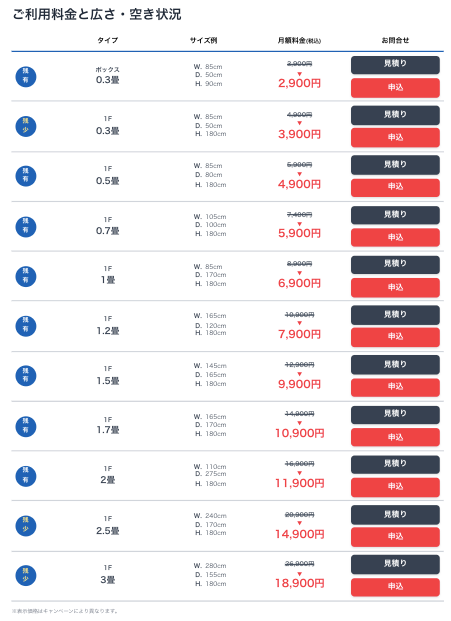 - 部屋タイプとサイズ、月額料金はこちら