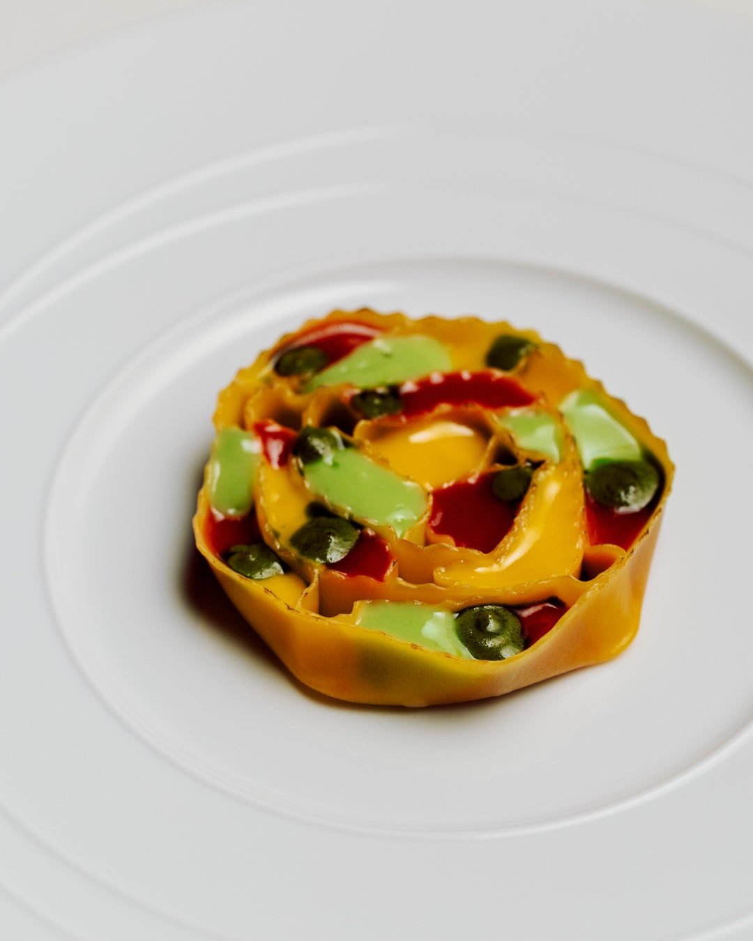 また「ラファエラのパルミジャーナ」はホリデーシーズンにラファエラが家族といつも食べていたプーリアのお菓子「カルテッラーテ」からインスピレーションを得ています。祖母から学んだパルミジャーナのレシピを、母から学んだトマト、ナス、バジルからなる3つのクリームで再解釈し、ラファエラが好きなローマ帝国のモザイク画風にアレンジしています。