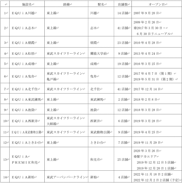 当社では沿線における事業の深耕による沿線価値の向上を目的に、今後も沿線主要駅において「EQUiA」を積極的に展開することで「東武の駅ナカ=“EQUiA”」としてブランド化を図るとともに、各駅の特性を踏まえて「モットタノシイエキヘ」をキャッチフレーズに便利で楽しい魅力的な店舗の誘致やお客さまの利便性向上に努めてまいります。