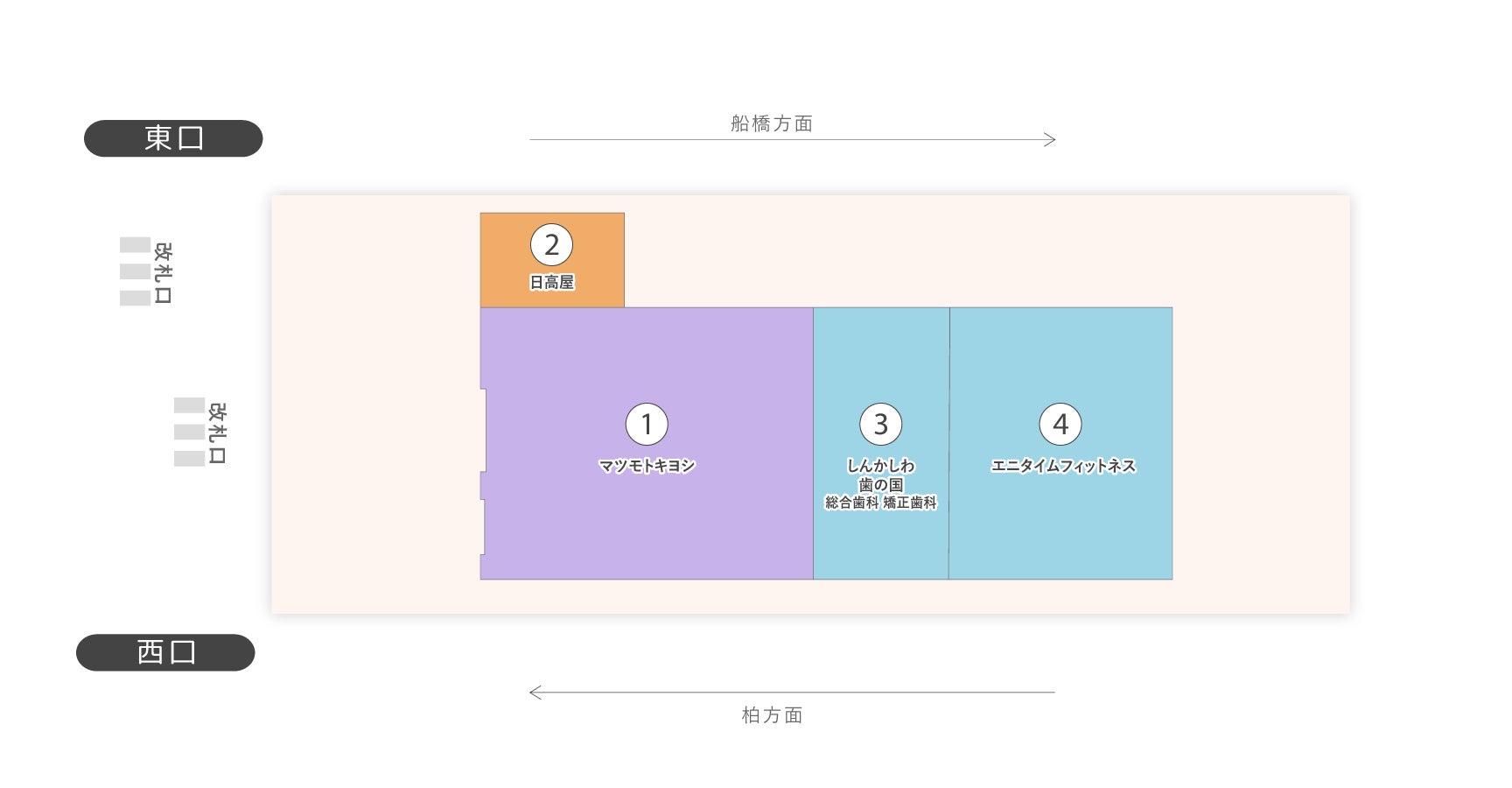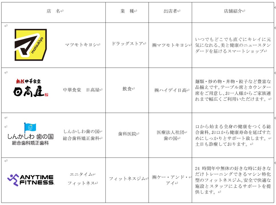 本施設では、新柏駅の利用者や地域住民の方々の生活に寄り添い、気軽に普段使いをしていただける商業施設を目指し、テナントとして日用品を幅広く取り扱うドラッグストア「マツモトキヨシ」のほか、昼夜を問わず気軽にご利用いただける飲食店「中華食堂 日高屋」や、地域密着型の歯科医院「しんかしわ歯の国デンタルクリニック」、会員制フィットネスジム「エニタイムフィットネス」を揃えます。