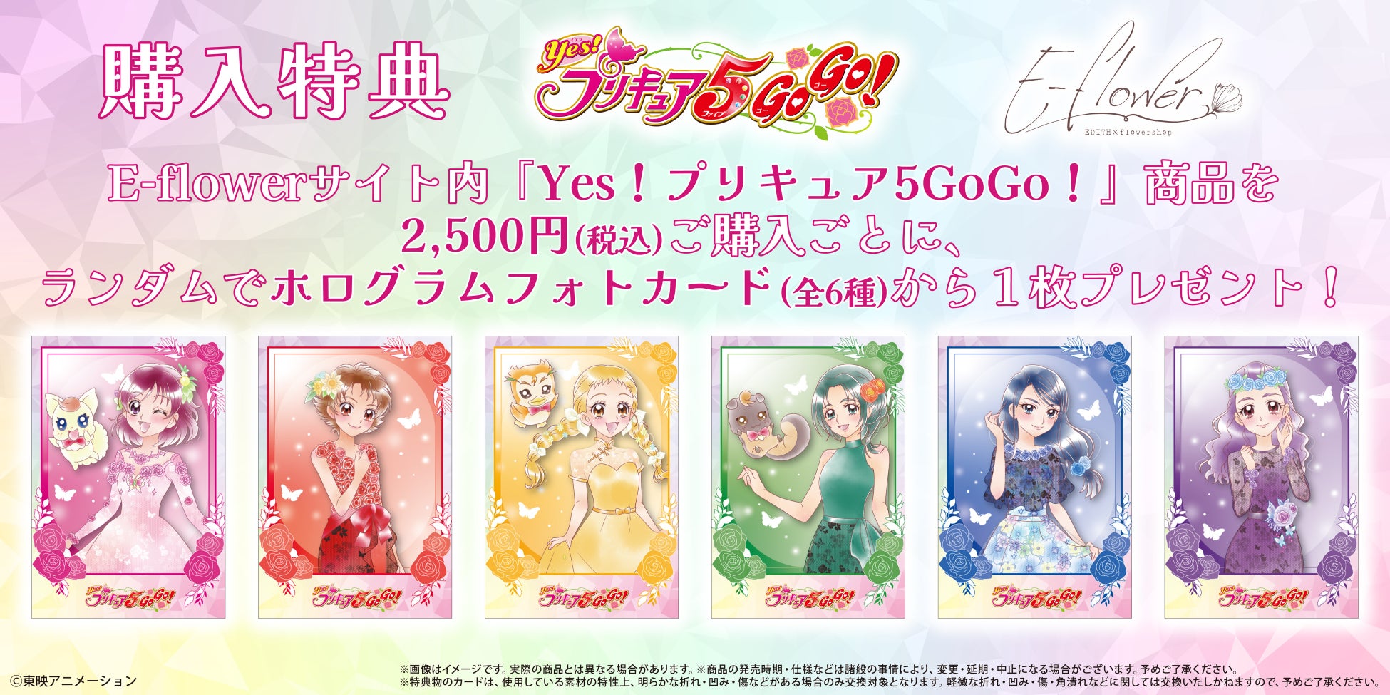E-flower通販サイト内で『Yes!プリキュア5GoGo!』商品を2,500円(税込)ご購入ごとに、ランダムで「ホログラムフォトカード(全6種)」から1枚プレゼント。