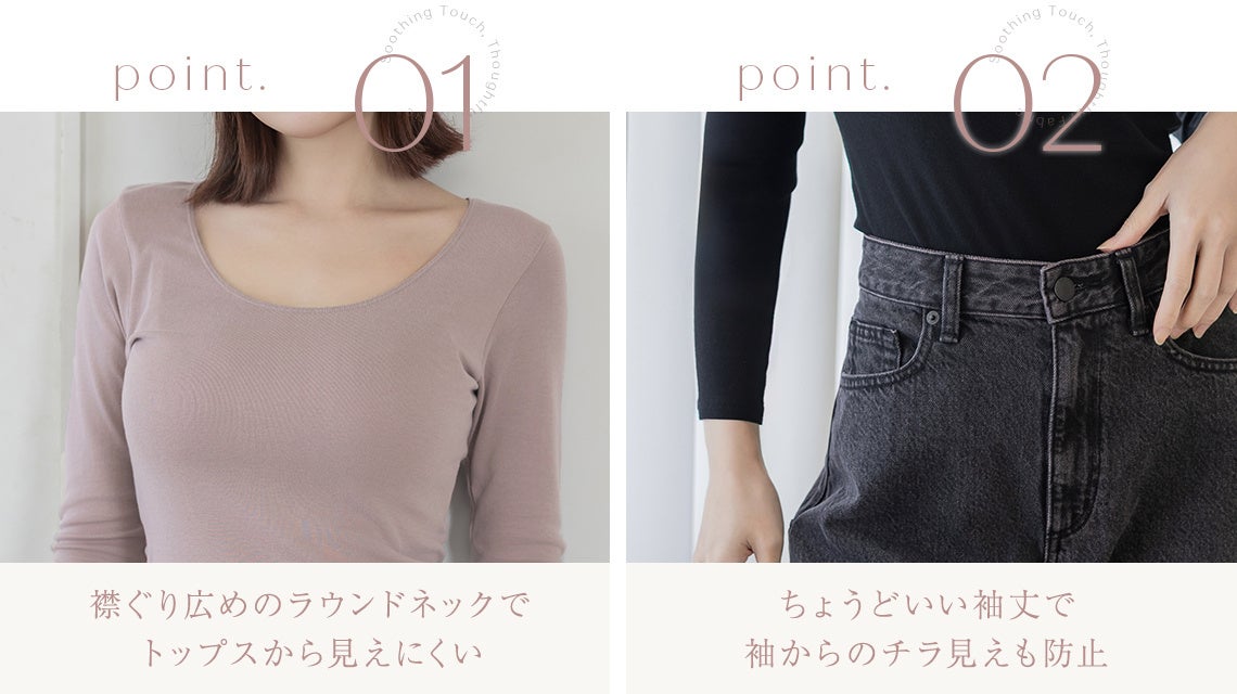 襟ぐり広めのラウンドネックで、首元の開いたトップスとも好相性◎。アウターから見えにくい袖丈なので、袖からのチラ見えも気になりません。