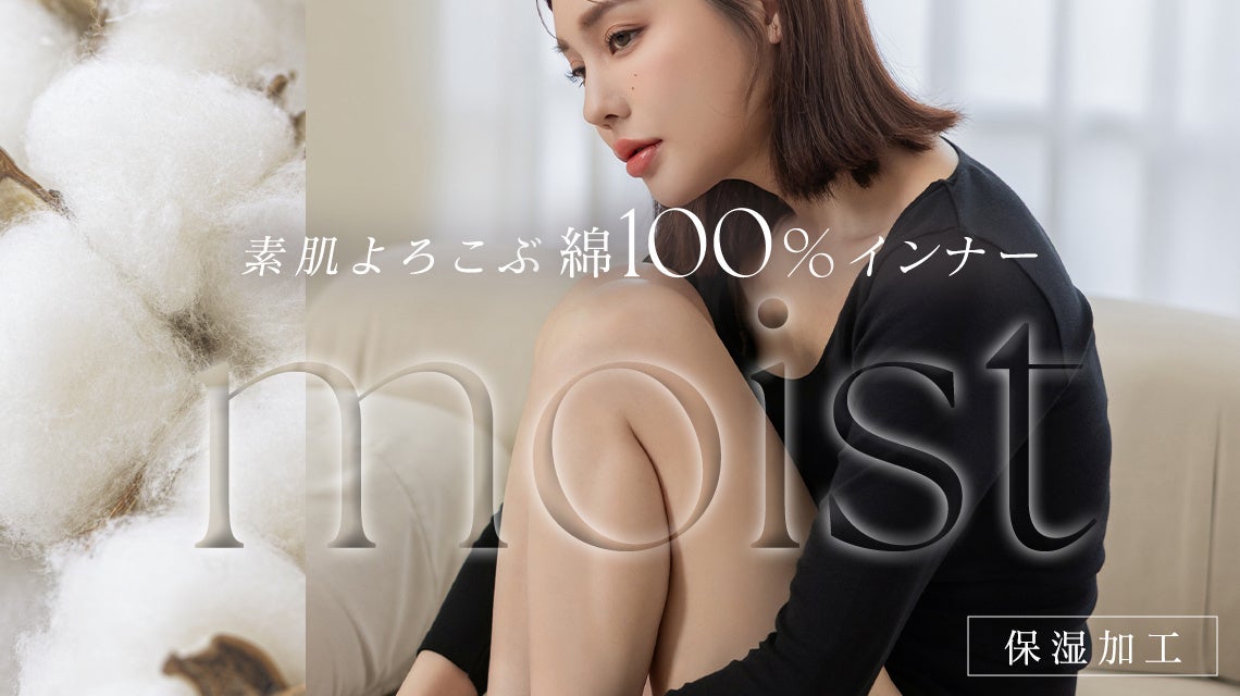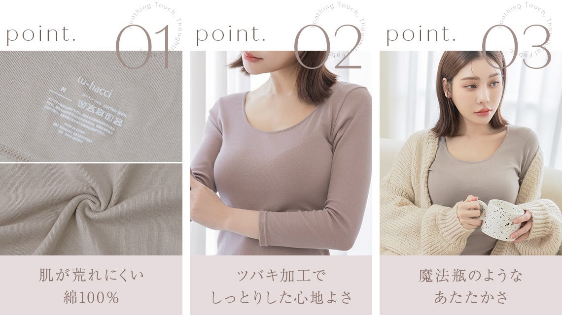 「綿100%」+「天然美容成分配合」、高い吸湿性で重ね着しても蒸れにくく、素肌にしっとりした心地よさを与えます。敏感な肌にもやさしい、潤い肌インナーです。