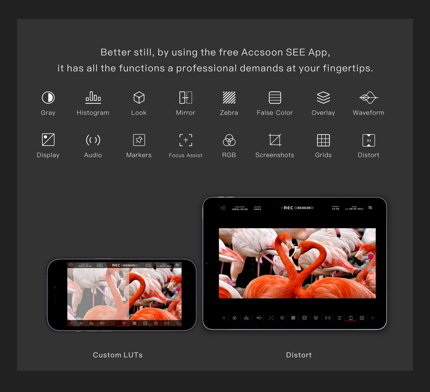 さらに、無料の Accsoon SEE アプリを使用することで、プロが要求するすべての機能をすぐに利用できます。