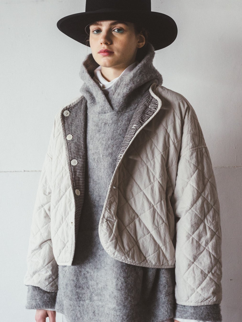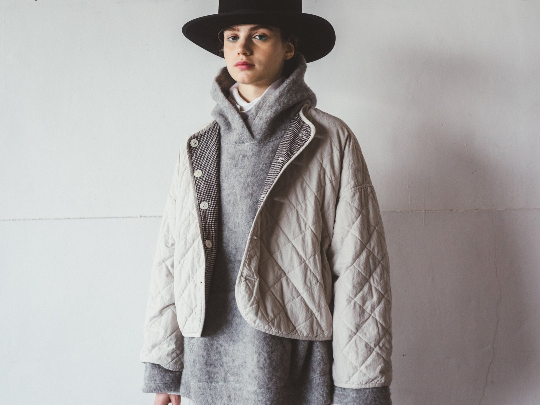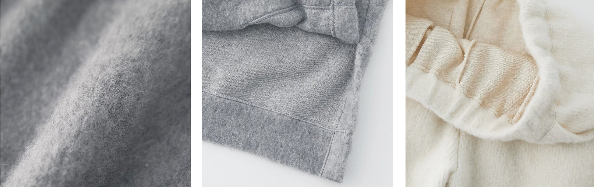 表側にウール糸、裏側に綿糸を使用したジャージ素材で仕立てた「フーディー」と「イージーパンツ」の2型を展開。裏毛のパイル糸をウールとナイロンの混紡糸でつくり、通常の裏毛のパイル面(裏側)を表面として使用してます。ニットよりもラフに着られ、軽く防寒性にも優れております。
