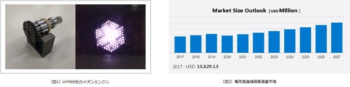 同社の人工衛星用推進機(イオンエンジン)(図1)は、従来から使われている化学推進機よりも約10倍*2、日本でも宇宙活動法*3で規制されるなど、世界で深刻な問題である宇宙ゴミ*4対策としても有効である点、電気推進機搭載衛星市場は年率8.56%の成長(図2)している点などから、今後ますますの発展が期待されます。