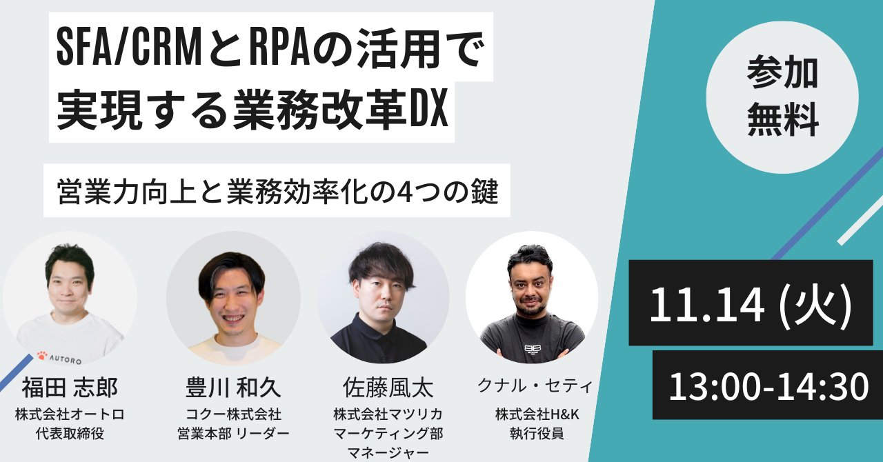 2023年11月14日(火)13時00分〜14時30分でZOOMにて「SFA/CRMとRPAの活用で実現する業務改革DX」について語るウェビナーを開催いたします。