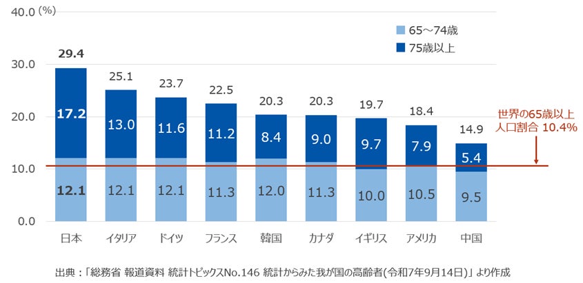 日本における65歳以上人口(2025年9月15日現在推計)は3,619万人で、総人口に占める割合は過去最高(29.4%)を更新しました。これを、主要国における2025年の65~74歳および75歳以上の人口の割合で比較すると、いずれも日本が最も高くなっています。
