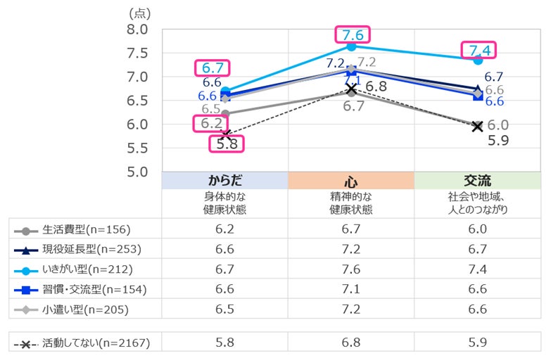 満足度の傾向はタイプごとに特徴あり。「活動=健康を支えること」を体現する「いきがい型」