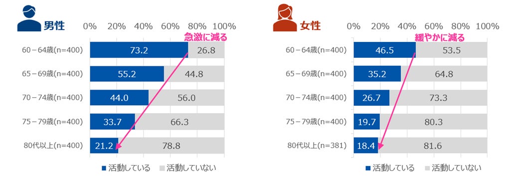 一方で、女性で就労・社会参加活動を行う割合は、世代の傾向として男性のようなフルタイム勤務が主流でなく、パートタイム勤務やボランティア活動を行う人も多いせいか、その減り方は緩やかです。