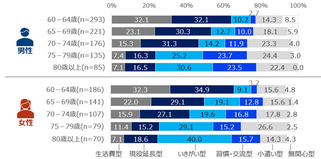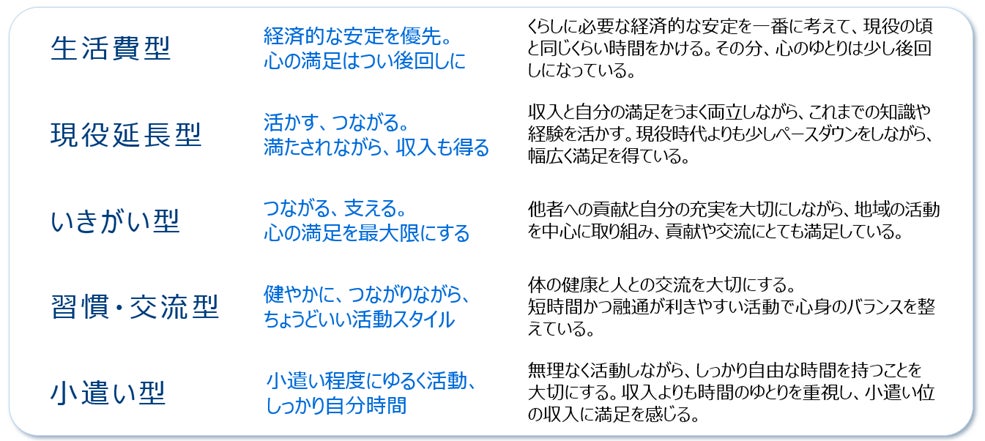 「生活費型」「現役延長型」「いきがい型」「習慣・交流型」「小遣い型」「無関心型」 -