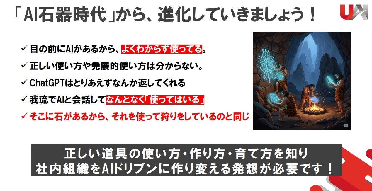 新しい研修プログラムでは、多くの企業が陥りがちな「担当者任せにしてしまう」「ツールを導入して満足してしまう」といった失敗を避け、組織的なゴールイメージを共有した上でのAI活用を目指します 。我流でAIを使う「AI石器時代」から脱却し、組織としてAIを正しく活用し、自走できる体制を構築するためのノウハウを提供します 。