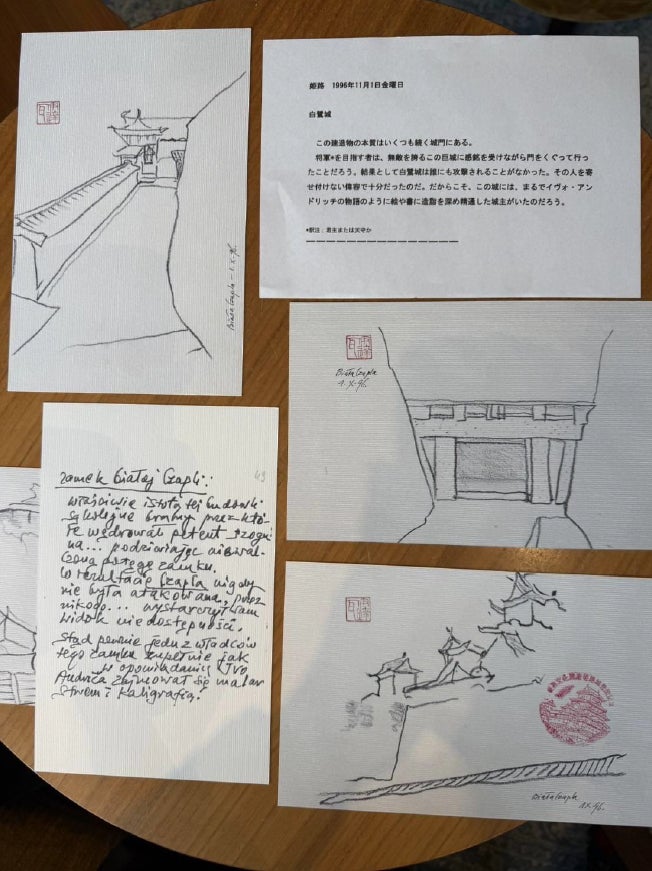 なお、協定調印式には、山下在ポーランド日本大使館広報文化センター長やインガルデン在クラクフ名誉総領事等のほか、故ワイダ監督の令夫人であり、同博物館の設立に向けてご尽力されたザフファトヴィッチ氏もご出席されました。同氏から、生前、ワイダ監督が姫路城を訪問した際に自身で描かれた姫路城のスケッチを姫路市立美術館に寄贈したいとのお申出を頂戴し、山田副市長より、深淵なる御礼を伝達しました。