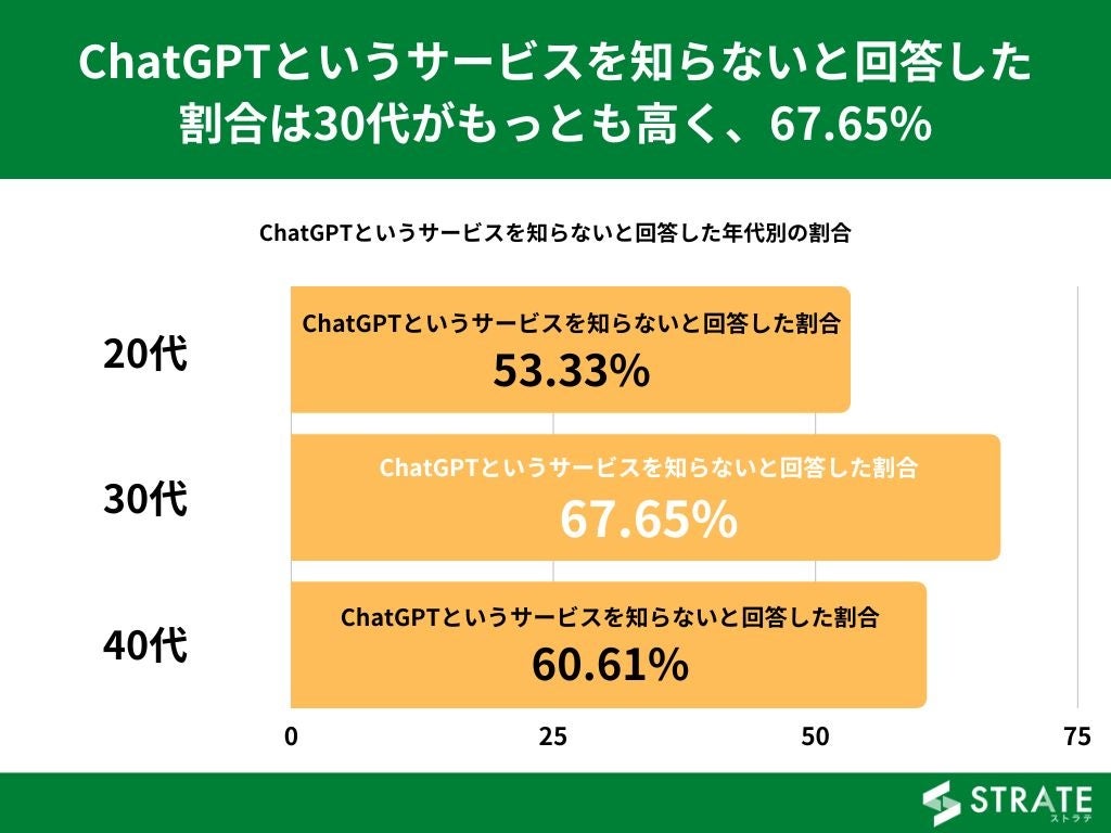 【ChatGPTというサービスを知らないと回答した割合は30代がもっとも高く、67.65%】