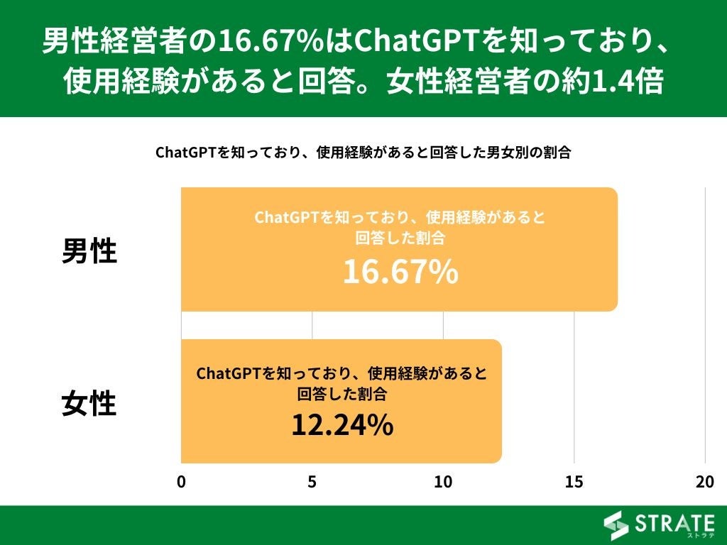 【男性経営者の16.67%はChatGPTを知っており、使用経験があると回答。女性経営者の約1.4倍】