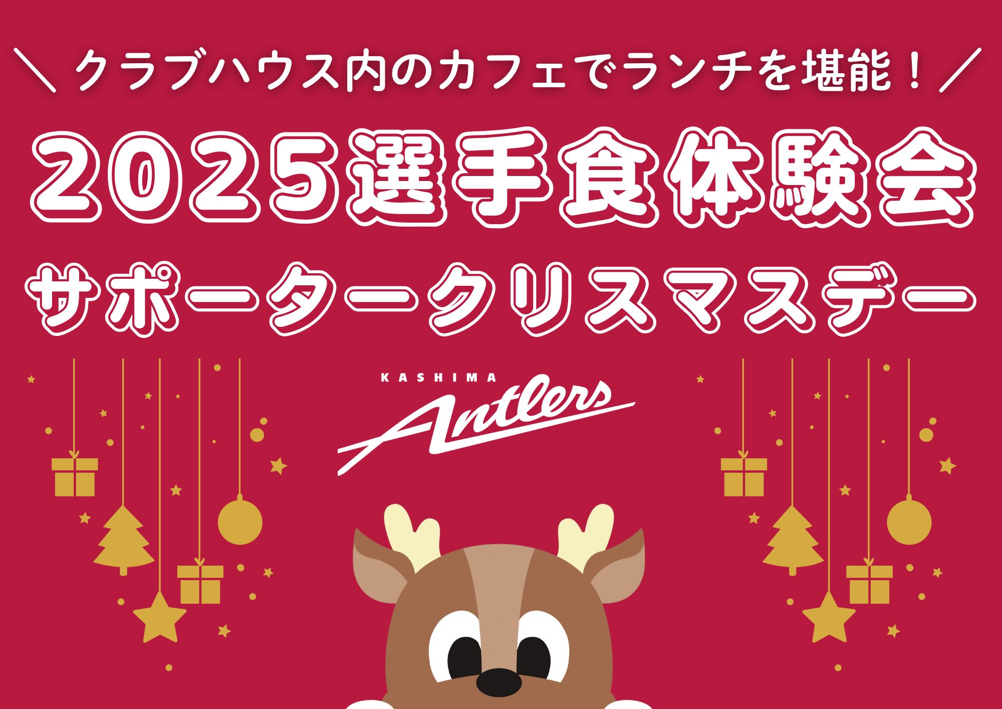 アントラーズの選手たちが最高のパフォーマンスを発揮するために日々食べているランチメニューをペアで体験できるスペシャルイベント「選手食体験会 サポータークリスマスデー」を12月24日(水)に2部制で開催しますので、お知らせいたします。