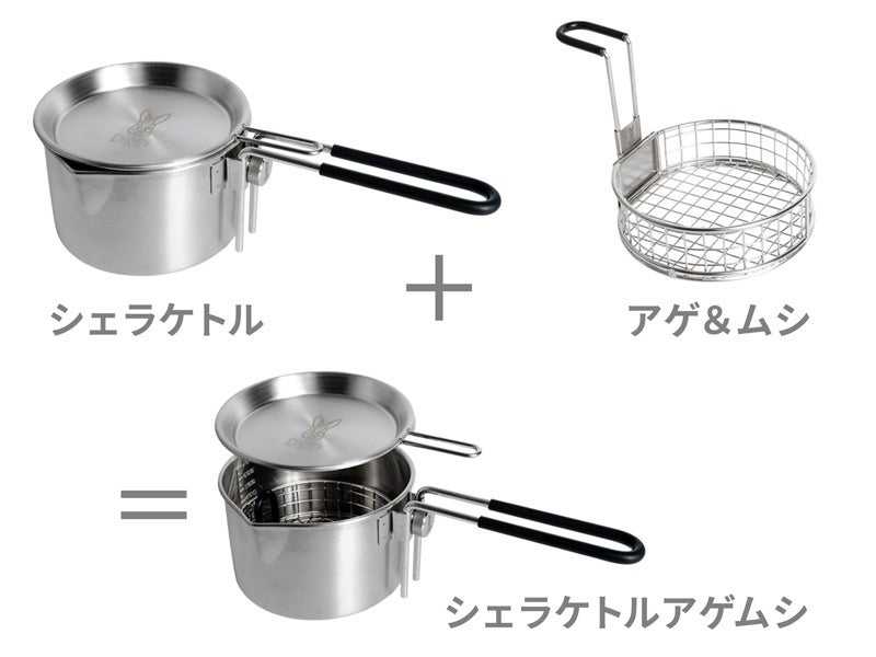 「シェラケトルアゲムシ」は、既存製品「シェラケトル」に新製品「アゲ&ムシ」を組み合わせたオールインワンのクッカーセットです。「アゲ&ムシ」は単品でも発売中です。