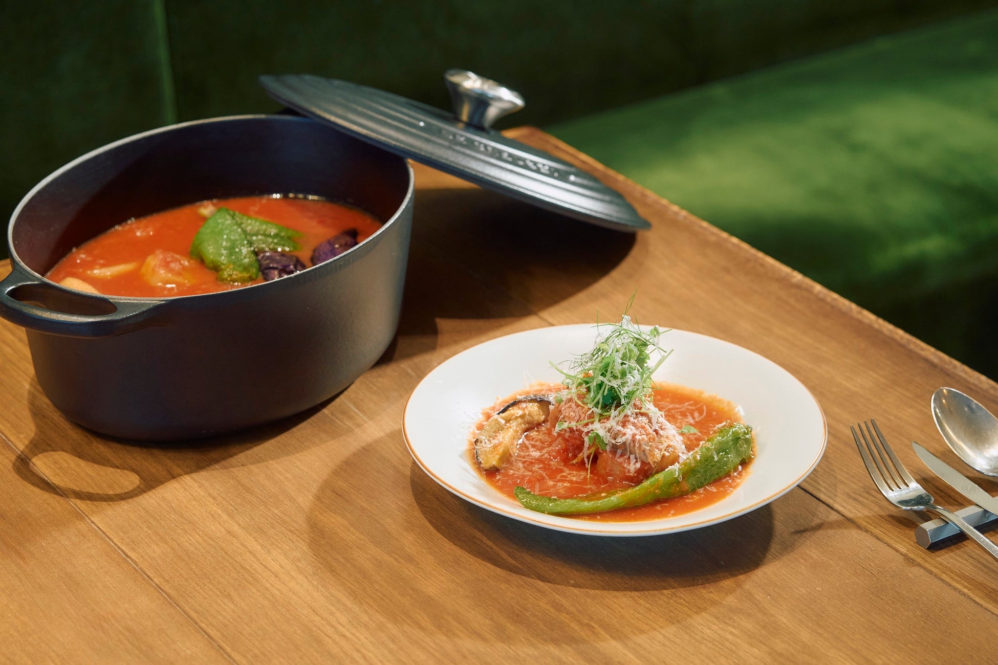 ・夏ガツオと大根、大玉トマトのスープ仕立て 揚げナスと揚げ甘長唐辛子添え