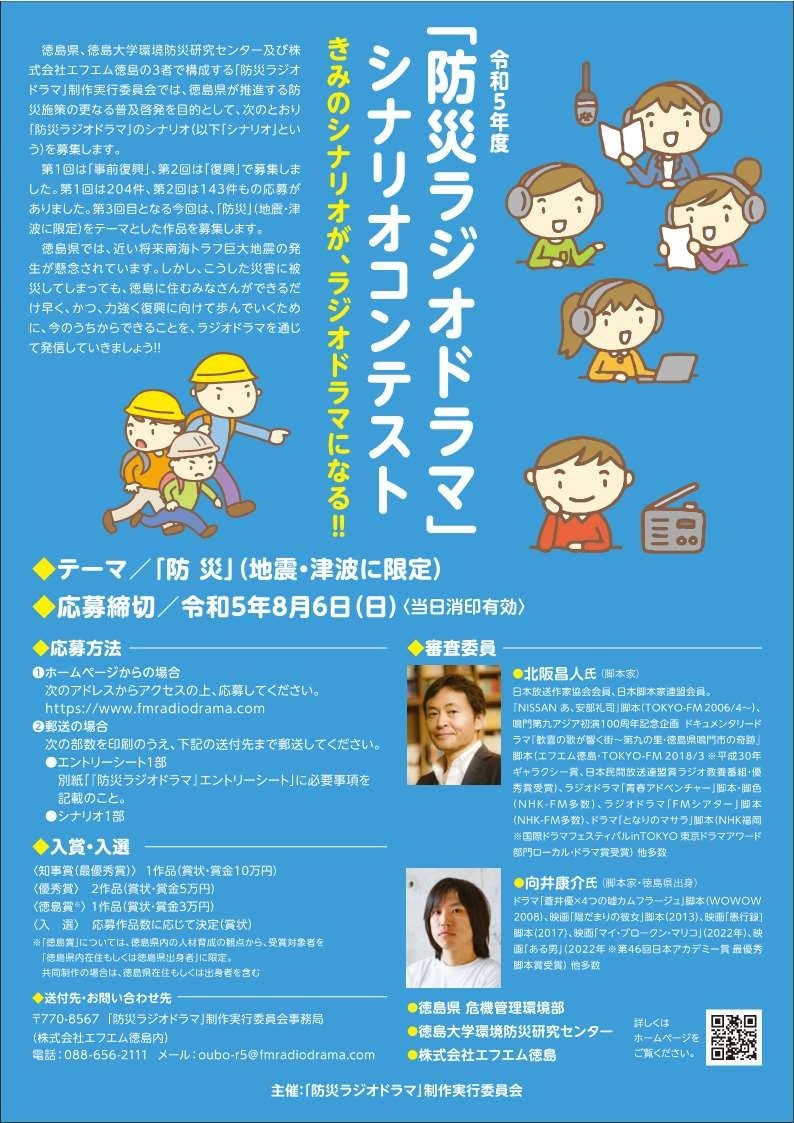 防災ラジオドラマ制作実行委員会(徳島県、徳島大学環境防災研究センター、(株)エフエム徳島)は、徳島県の防災施策を普及・啓発するため、「防災ラジオドラマ」のシナリオを募集します。
