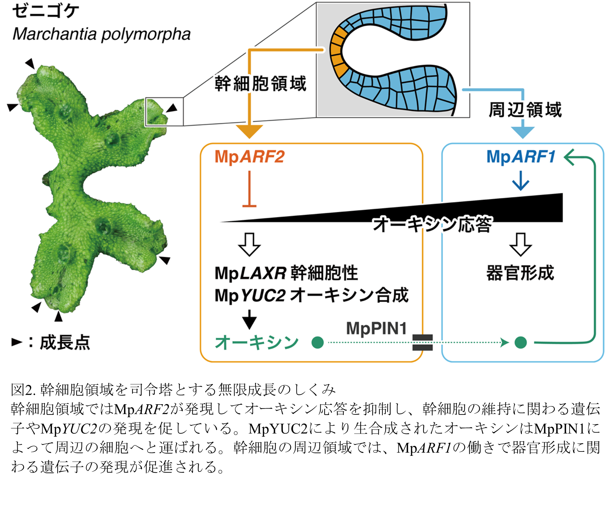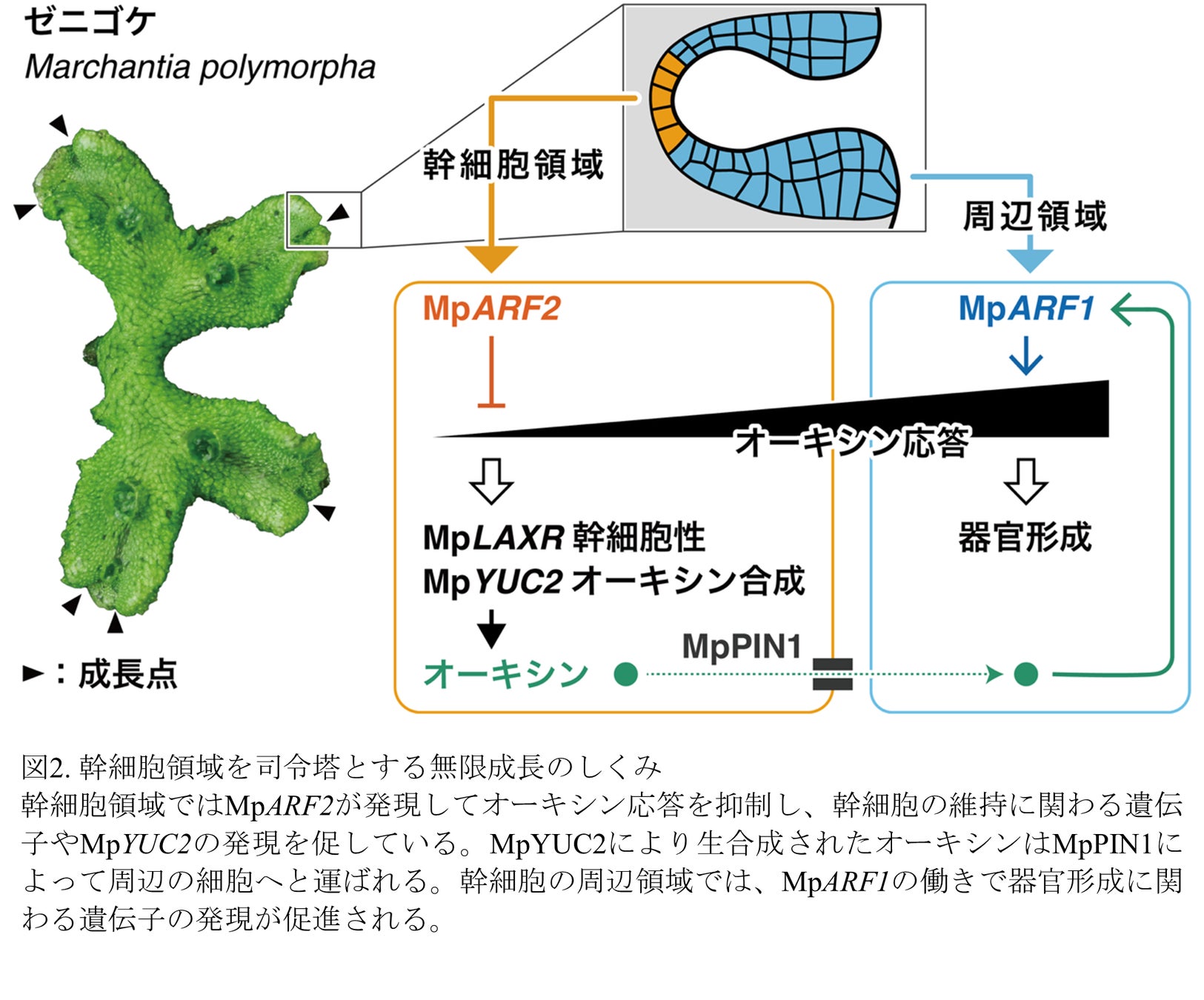 幹細胞領域は、オーキシンを介して周辺領域の分化を指示しつつ、自身はその影響を受けないという、成長点の司令塔(オーガナイザー)として機能しており、MpARF2はその中核的な因子である。