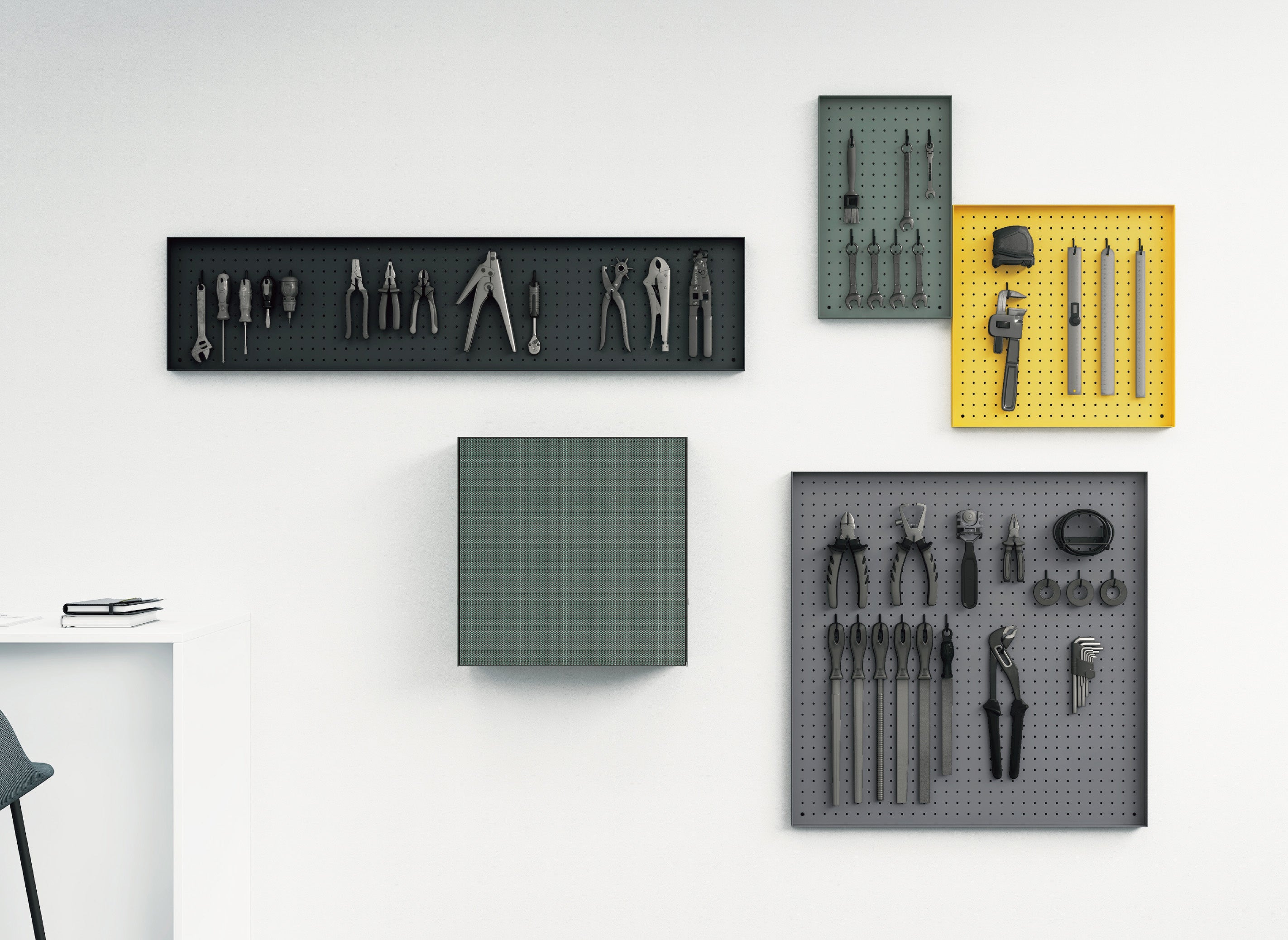 「WAKERS」は、壁面に道具や文具をアートのように飾ることができる収納家具です。オフィス空間に飾られるアートが持つ本来の力を人の創造力を高めることと再定義し、一人ひとりがより創造的になれる道具収納を設計しました。デザイン戦略家である太刀川 英輔氏が率いるNOSIGNER※との協業で実現しました。ミニマルアートのような見えない道具収納「BOX(ボックス)」と、道具や文具をアートのように飾ることができる見せる道具収納「WALL(ウォール)」があり、「BOX」は、閉じている時にアート作品のような存在感を示し、開くとその場が作業台になります。薄さを追求した側面の板など、細部の仕上げに徹底的にこだわり、ミニマルアートのようなソリッドな形状の収納を実現しました。「WALL」は、周囲の薄いエッジにより額装されたアート作品のように道具や文具を際立たせて収納できる有孔ボードのフレームです。