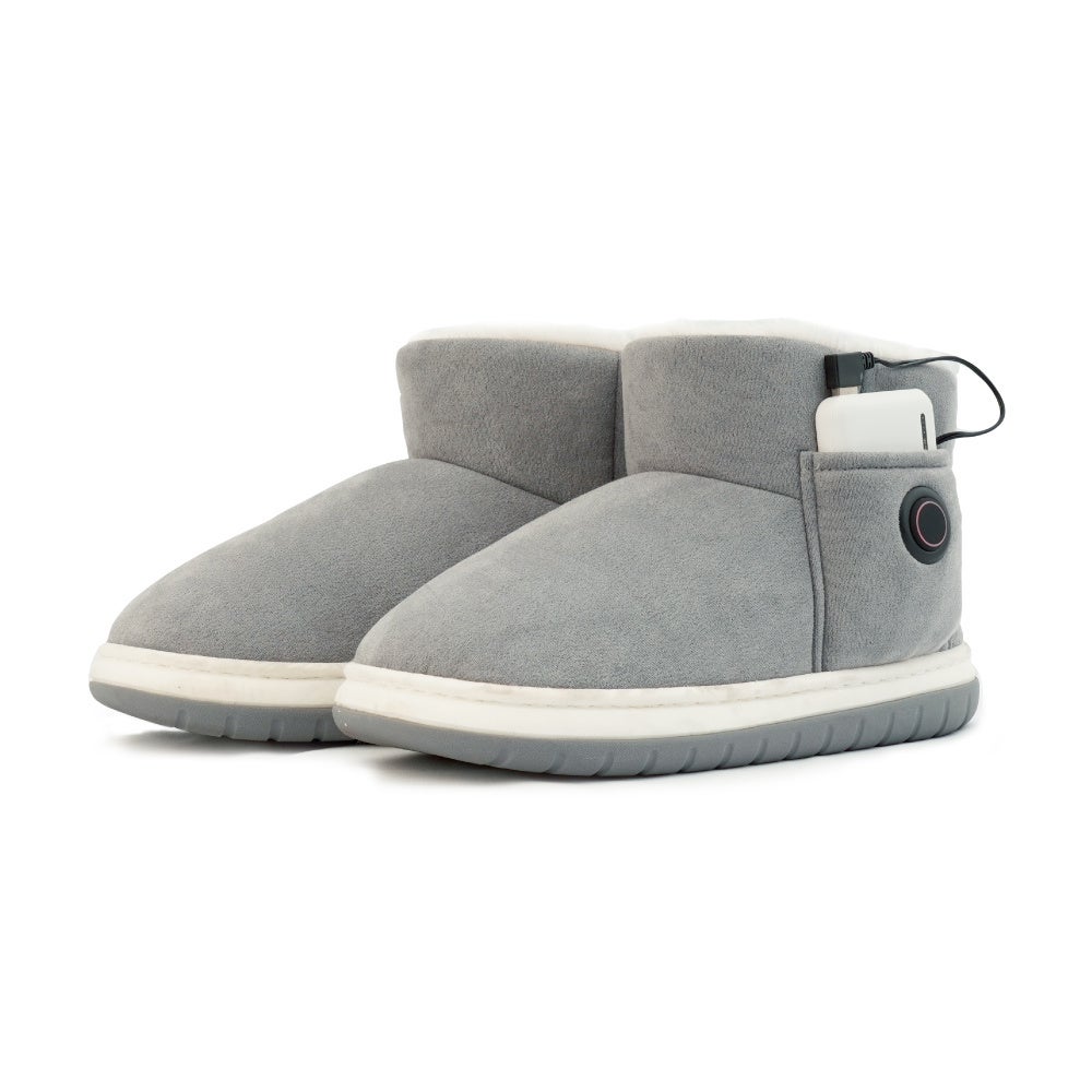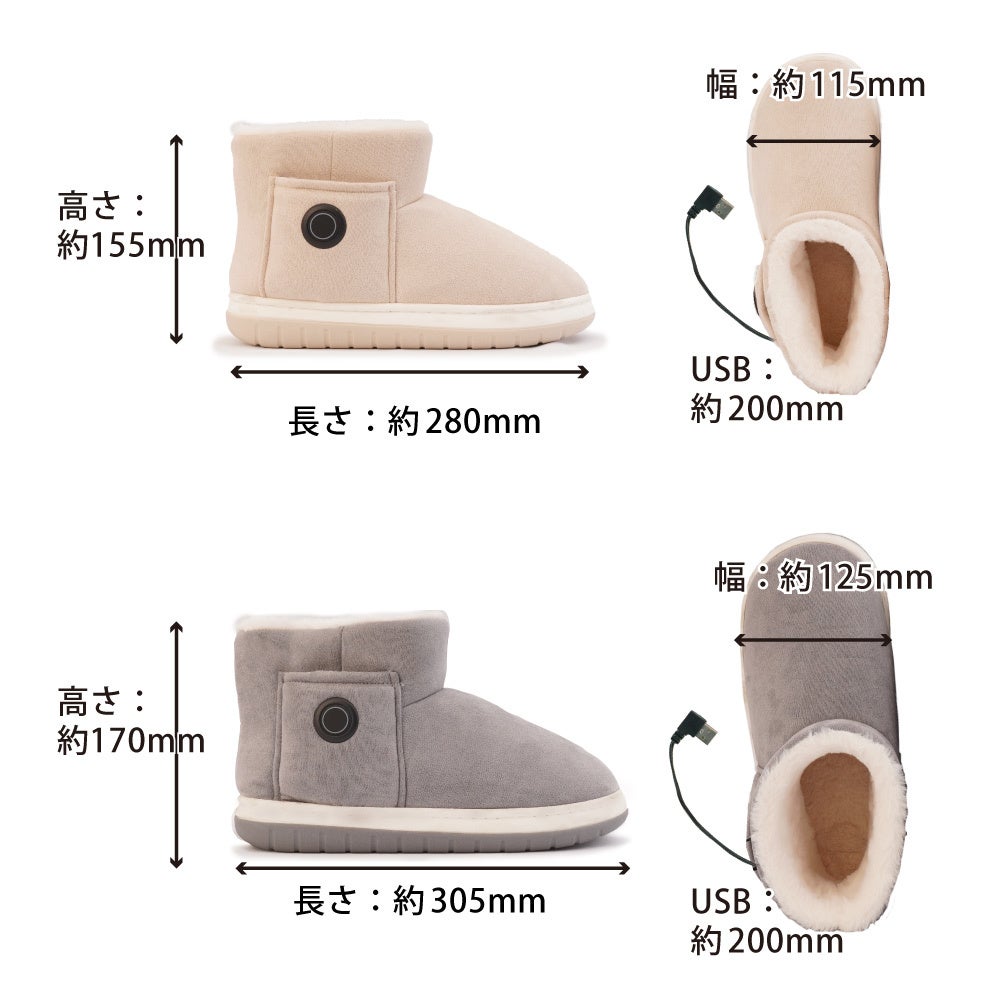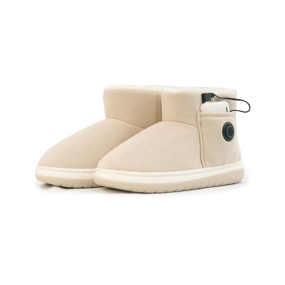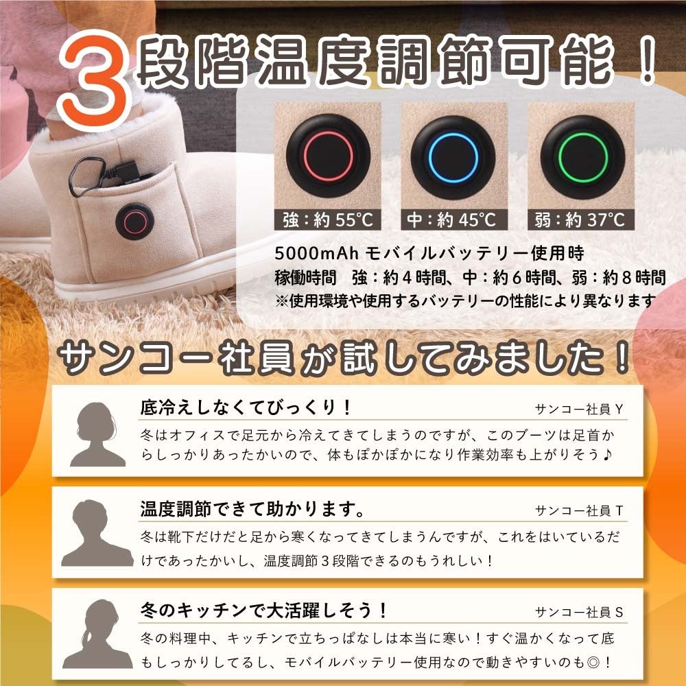 側面に電源ボタンを長押しで電源ON。電源ボタンを押すごとに温度調整(3段階)が可能(強約55℃、中約45℃、弱約37℃)。5000mAHモバイルバッテリー使用時の稼働時間は強約4時間、中約6時間、弱約8時間動作。靴を履いた時にあたる足裏部分にヒーターを内蔵。厚みのあるソールで足元が寒くなる場合にも暖かく過ごせます。内側には足首まで起毛ボアを採用し、電源を入れなくても暖かい。