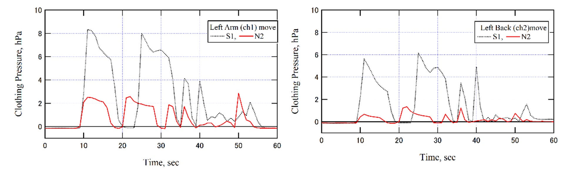 S1が従来のスーツ、N2が肩くるしくないスーツです。横軸の時間に沿って手を挙げたり回したりする動作を行った時の衣服圧が縦軸となっています。縦軸の値が大きいほど体にかかる圧力が大きく、動きにくいことを示します。※特別縫製仕様によるスーツ着用時の衣服内圧の比較検証
