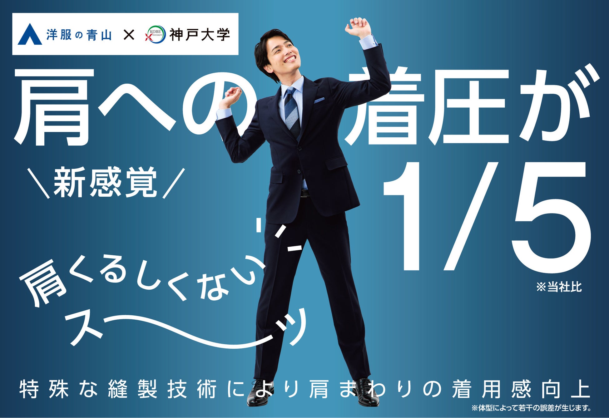 青山商事株式会社(本社:広島県福山市/代表取締役社長:青山理(おさむ))は、「洋服の青山」と「神戸大学」の産学共同研究により肩への着圧が5分の1になることを実現したスーツを、10月10日(木)から全国の洋服の青山および、公式オンラインストアで発売します。