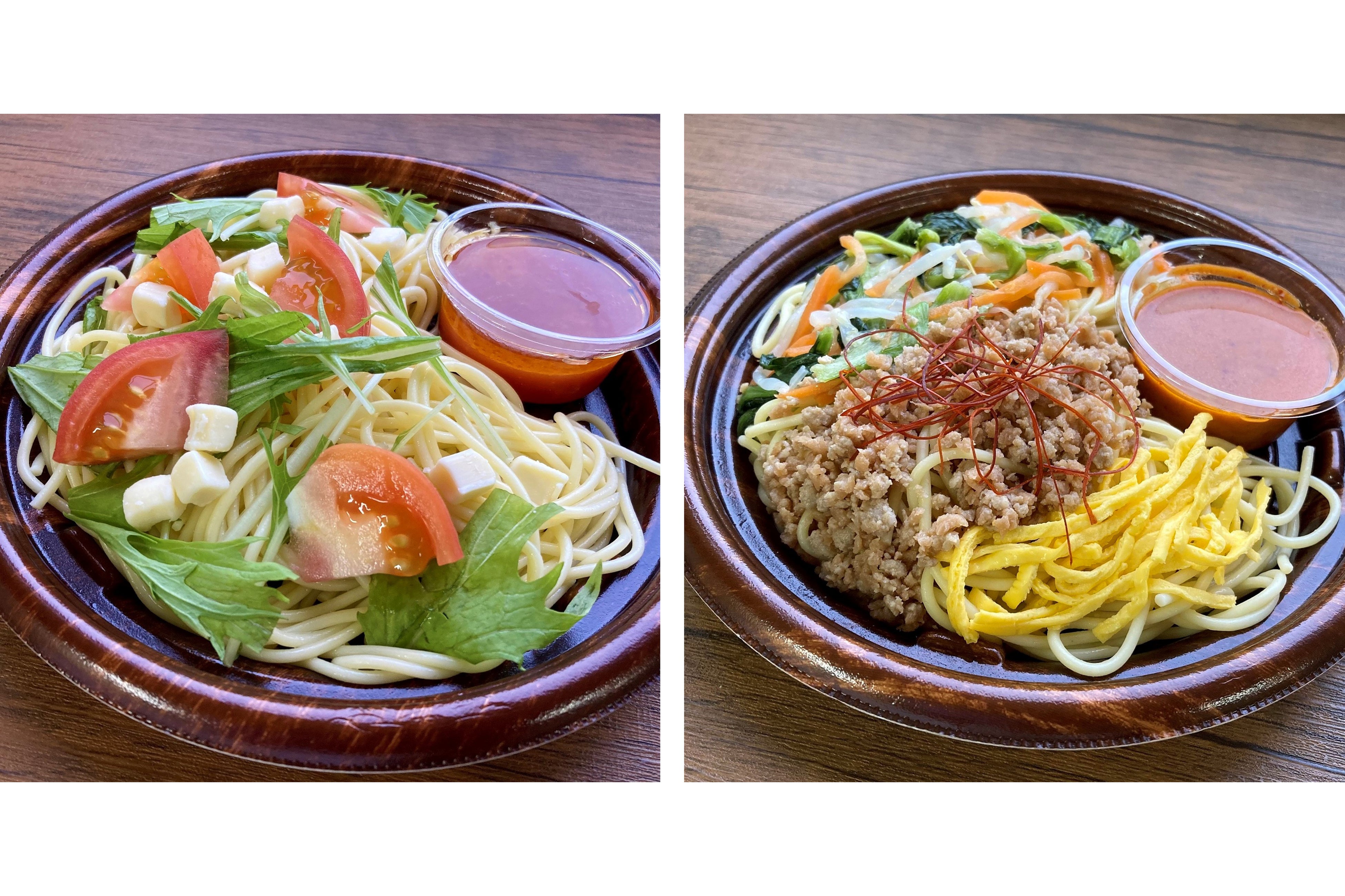 『アマニ油使用!トマトの冷製パスタ』は夏が旬のトマトをトッピングとソースに使用し、さっぱりと仕上げた冷製パスタです。キューブ状のプロセスチーズとフレッシュな水菜をトッピングし、色鮮やかな見た目も楽しめる一品です。ソースにはオメガ3系脂肪酸を多く含むアマニ油をプラスしました。『大豆ミート使用!ビビンバ風冷製パスタ』はそぼろ、ミックスナムル、錦糸卵が乗ったパスタに、食欲をそそるピリ辛のソースをかけて食べるビビンバ風の冷製パスタです。そぼろ部分に大豆ミートを使いヘルシー感も訴求しました。