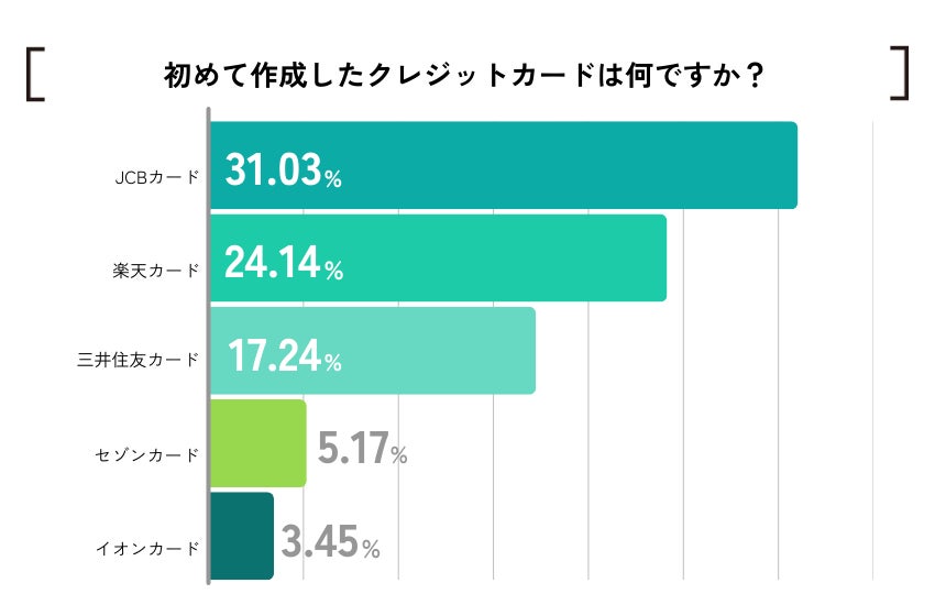 高齢者が初めて作成したクレジットカードは「JCBカード」が最多で約31%。次いで「楽天カード」が約24%を占める。