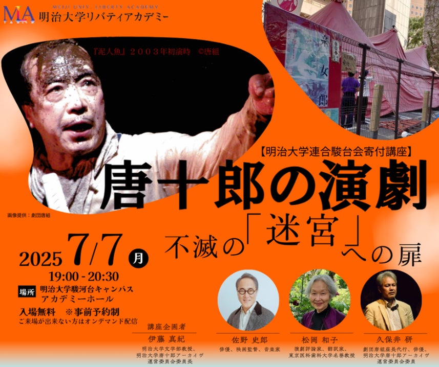 明治大学の生涯学習機関「明治大学リバティアカデミー」は、7月7日(月)に公開講座「唐十郎の演劇-不滅の『迷宮』への扉-」を駿河台キャンパスで対面およびオンラインで開催します。事前予約制で、参加費は無料です。