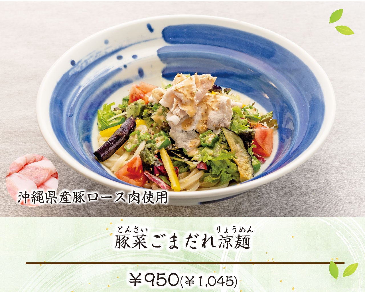 沖縄県産豚ロースの冷しゃぶと特製ごまだれ冷やしスープと旬の野菜をたっぷり使用した、初夏の人気メニューをご用意しました。暖かくなるこの時期にしか味わえない