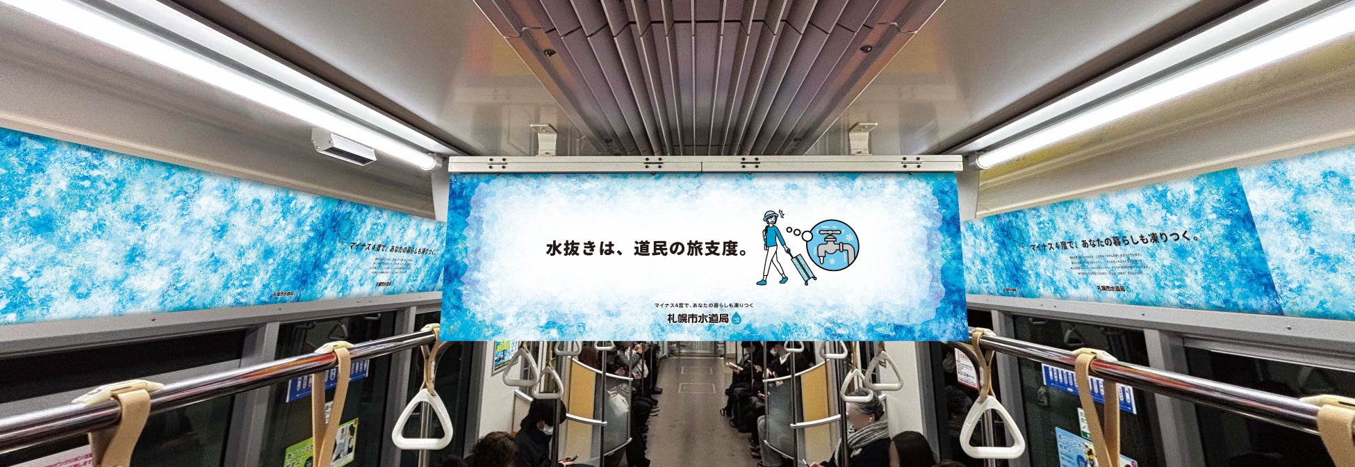 札幌市営地下鉄 東豊線の1編成(全4車両)すべての車内ポスター広告を「氷」のビジュアルでジャック。車両全体がまるで凍りついたようなインパクトある空間を演出することで、ダイレクトに凍結を注意喚起し、水道凍結対策への関心へとつなげる取り組みです。