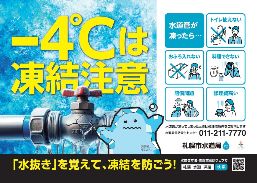 札幌市水道局では、毎年12月から2月にかけて多発する水道凍結事故を防ぐため、凍結防止対策の重要性を札幌市民の皆様へ広く訴える施策「凍結列車」を、2026年2月2日(月)から2月15日(日)までの約2週間、札幌市営地下鉄 東豊線の車両内で展開します。