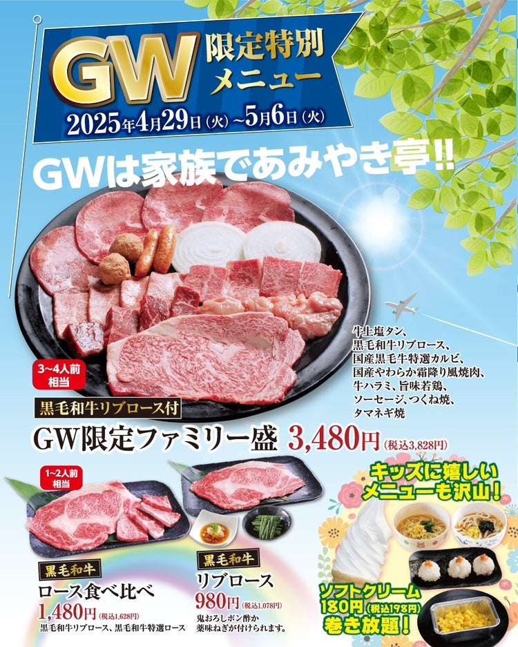 株式会社あみやき亭(代表取締役社長:宮崎卓也)が運営する中部あみやき亭はGWも休まず営業します!!