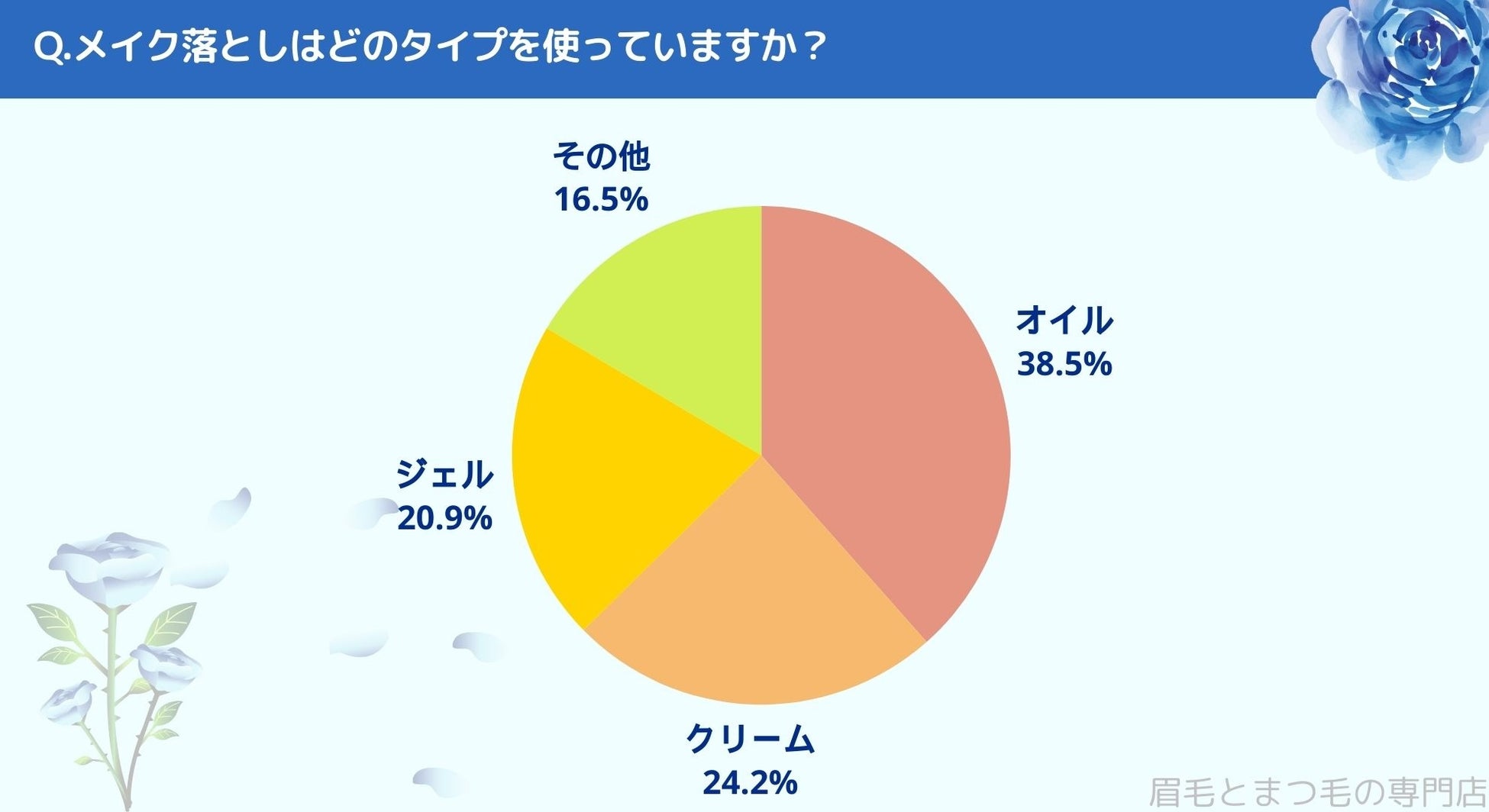 メイク落としでどのタイプを使っているかお聞きしたところ「オイル(38.5%)」、「クリーム(24.2%)」、「ジェル(20.9%)」、「その他(16.5%)」という結果になりました。