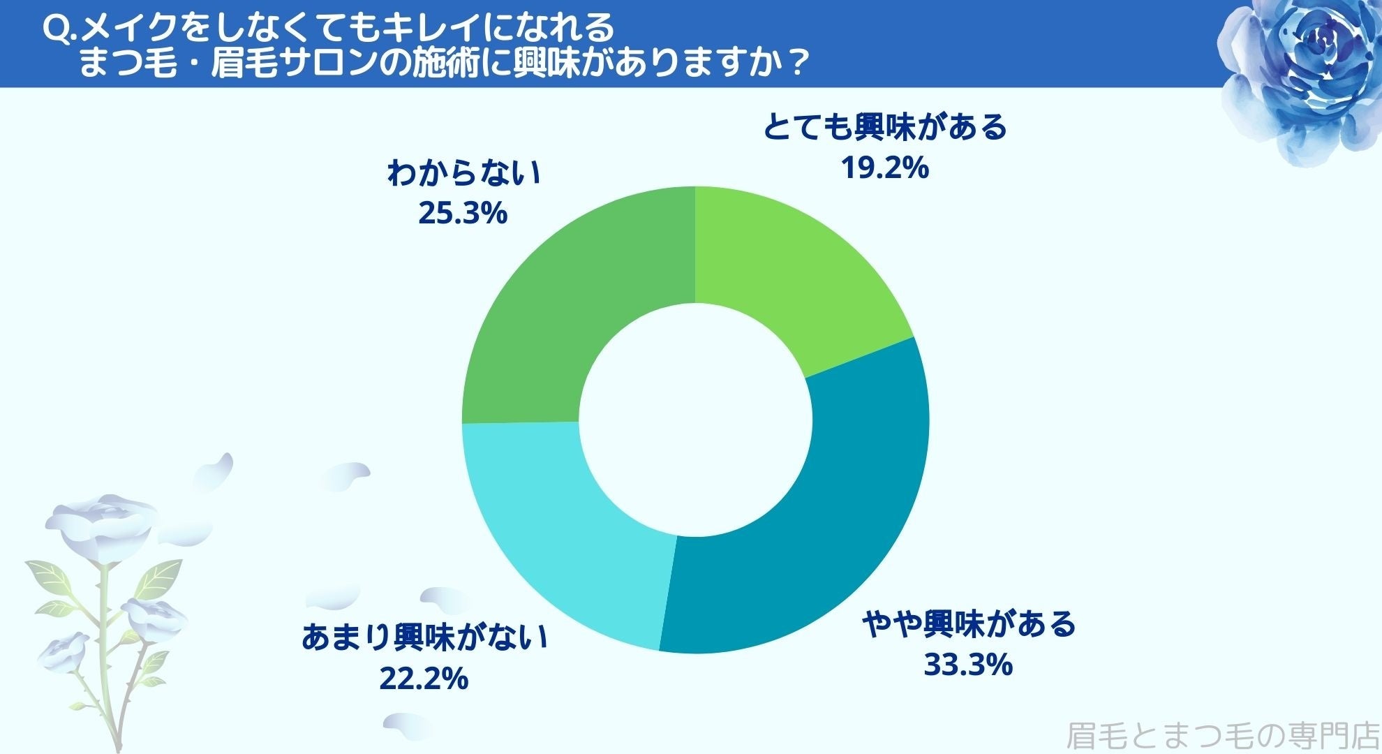 メイクをしなくてもキレイになれるまつ毛・眉毛サロンの施術に興味があるかお聞きしたところ「とても興味がある(19.2%)」、「やや興味がある(33.3%)」、「あまり興味がない(22.2%)、「わからない(25.3%)」という結果になりました。